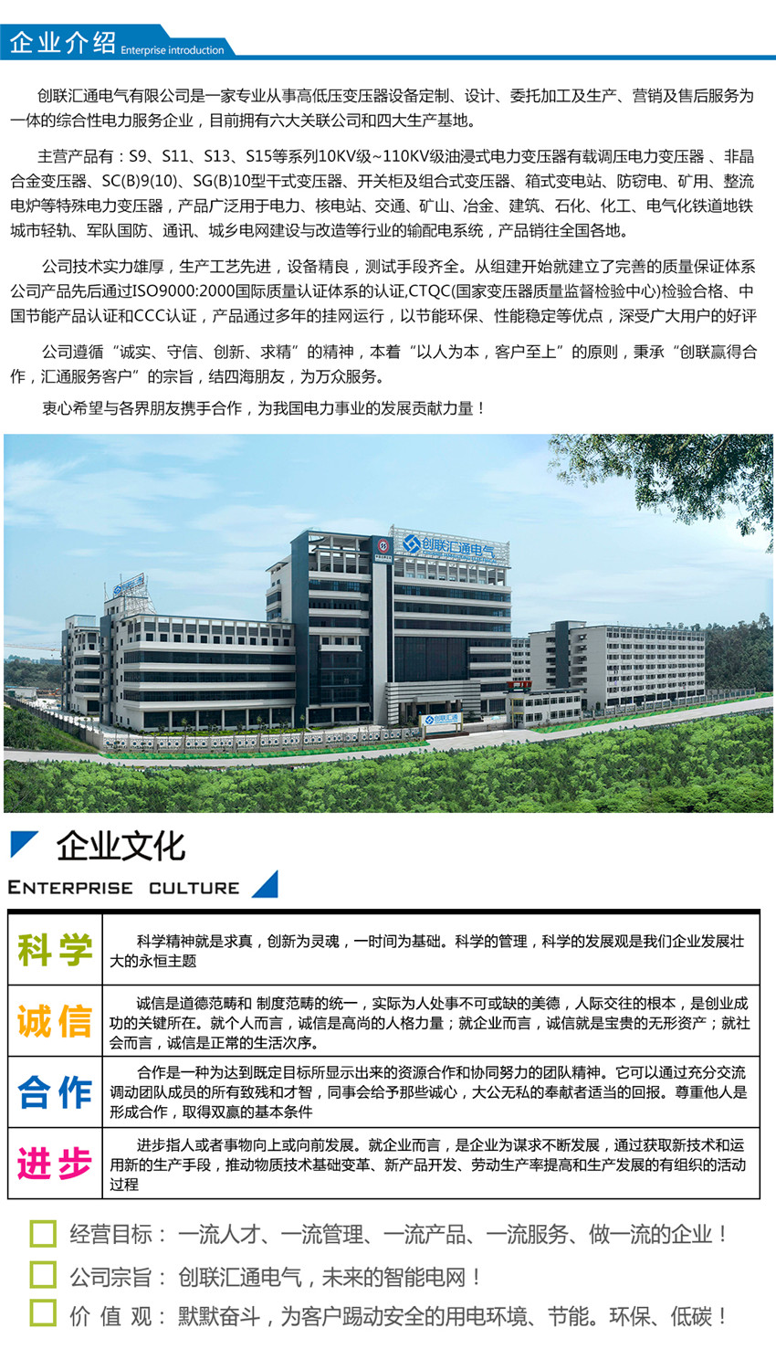 創(chuàng)聯(lián)匯通主營產(chǎn)品有:S11(13)、S20(22)新能效及SH15系列10KV級~110KV級油浸式電力變